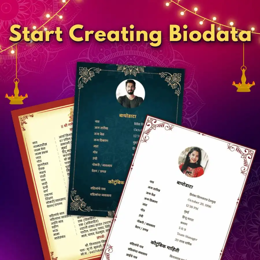 Create beautiful bio data for marriage in Marathi and English within minutes. Use our free biodata maker for marriage, available in PDF and Word formats.